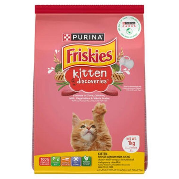افتح عالمًا سحريًا من الاكتشاف لقطتك الصغيرة مع كل لقمة من طعام القطط الجاف FRISKIES® Kitten Discoveries. هذه الحبيبات الصغيرة مصنوعة من العديد من النكهات المثيرة واللذيذة مثل التونة والدجاج والحليب والخضروات والحبوب الكاملة، لتلبية رغبة قطتك الصغيرة في المغامرة. يوفر FRISKIES® Kitten Discoveries لقطتك تغذية كاملة ومتوازنة ويحتوي على البروتين والأحماض الدهنية الأساسية مع أوميغا 3 و6، مضادات الأكسدة، التورين، الكالسيوم، وفيتامين د لتلبية احتياجات التغذية لقطتك الصغيرة.