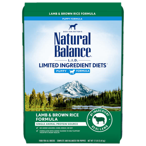 ناتشورال بالنس® ليميتيد إنجريدينت دايتس® تركيبة لحم الضأن والأرز البني طعام جاف للجراء من ديك فان باتن يقدم لجروك طعام كلاب عالي الجودة مع عدد محدود من مصادر البروتين والكربوهيدرات.