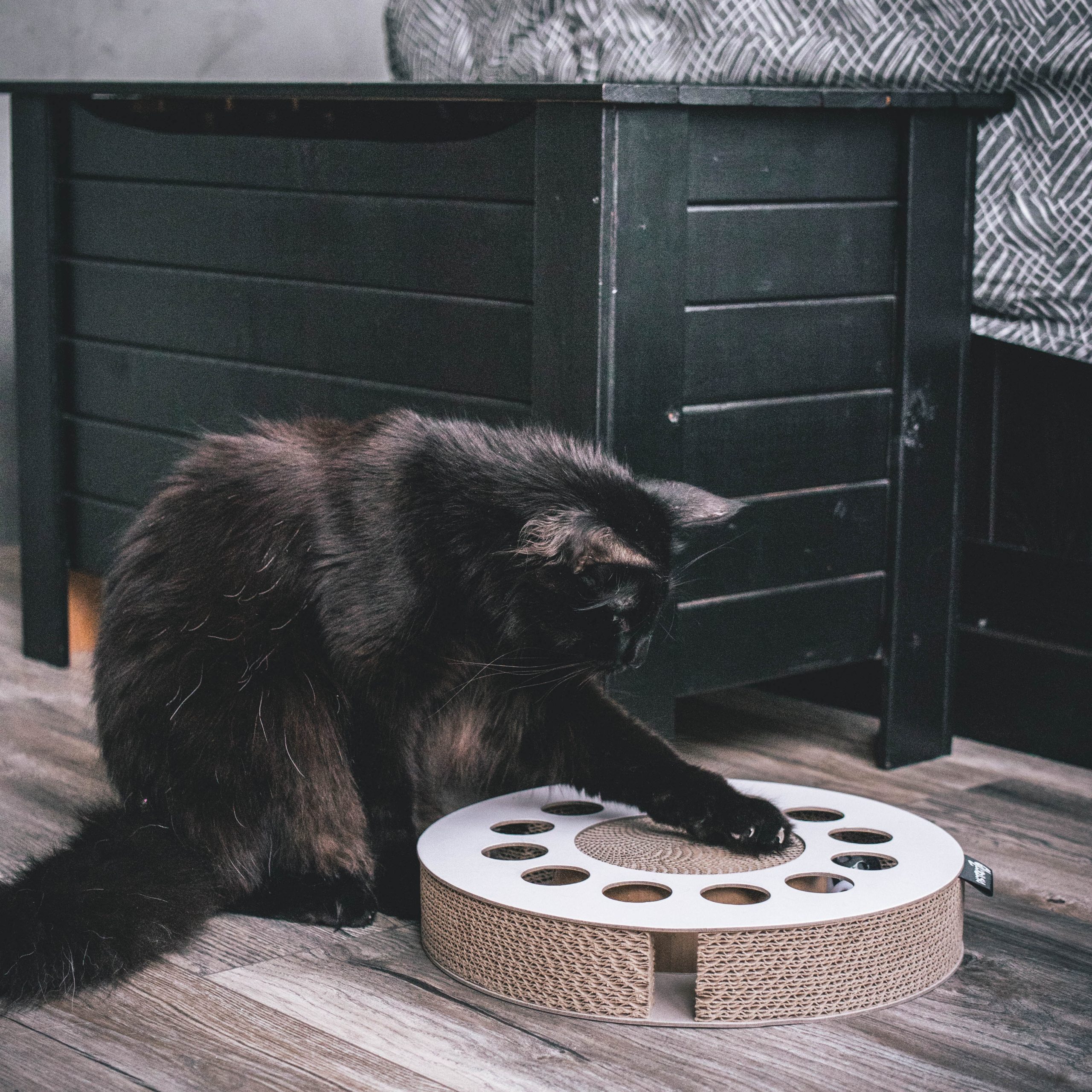Available in two colours, the circular-shaped WHIRL will become a favourite for many cats. This multifunctional toy provides maximum enjoyment but takes up little space in your home. In addition, it serves double duty as a cat scratcher and fun toy. The eco-friendly corrugated cardboard helps your cat to shed its outer nail layer and maintain healthy claws. However, the most exciting part of this WHIRL is found inside – a ball with bell, perfect for your cat to chase around. With 12 round openings on top of the WHIRL, your cat can poke its paws through the holes to try and reach the ball inside.
