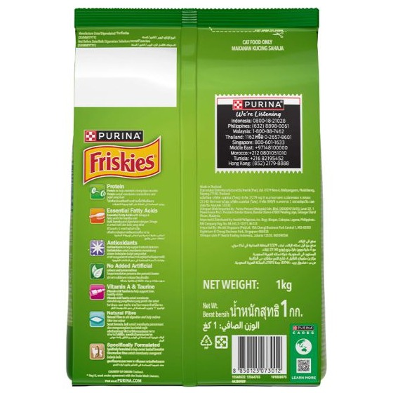 FRISKIES Adult Indoor Delights Dry Cat Food is formulated to promote healthy weight and help control hairballs with flavours of salmon, tuna, chicken, beef and vegetables that your cat will enjoy! FRISKIES Indoor Delights provides your cat a complete and balanced nutrition, contains protein, essential fatty acids with Omega 3 & 6, antioxidants and taurine to meet your cat’s daily nutrition needs.