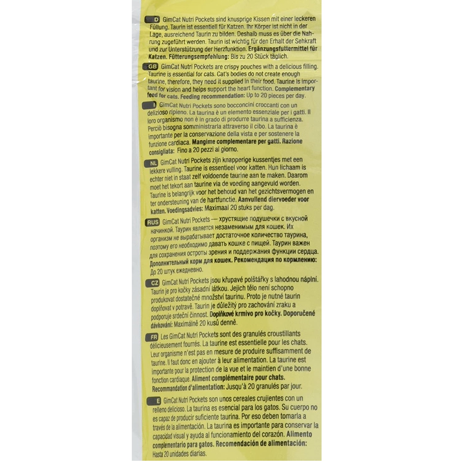 GimCat Nutri Pockets are crispy pouches with delicious filling. Taurine is essential for cats. Their bodies do not produce enough taurine, so it must be given to the cat with food. Taurine is important for maintaining visual acuity and maintaining heart function.