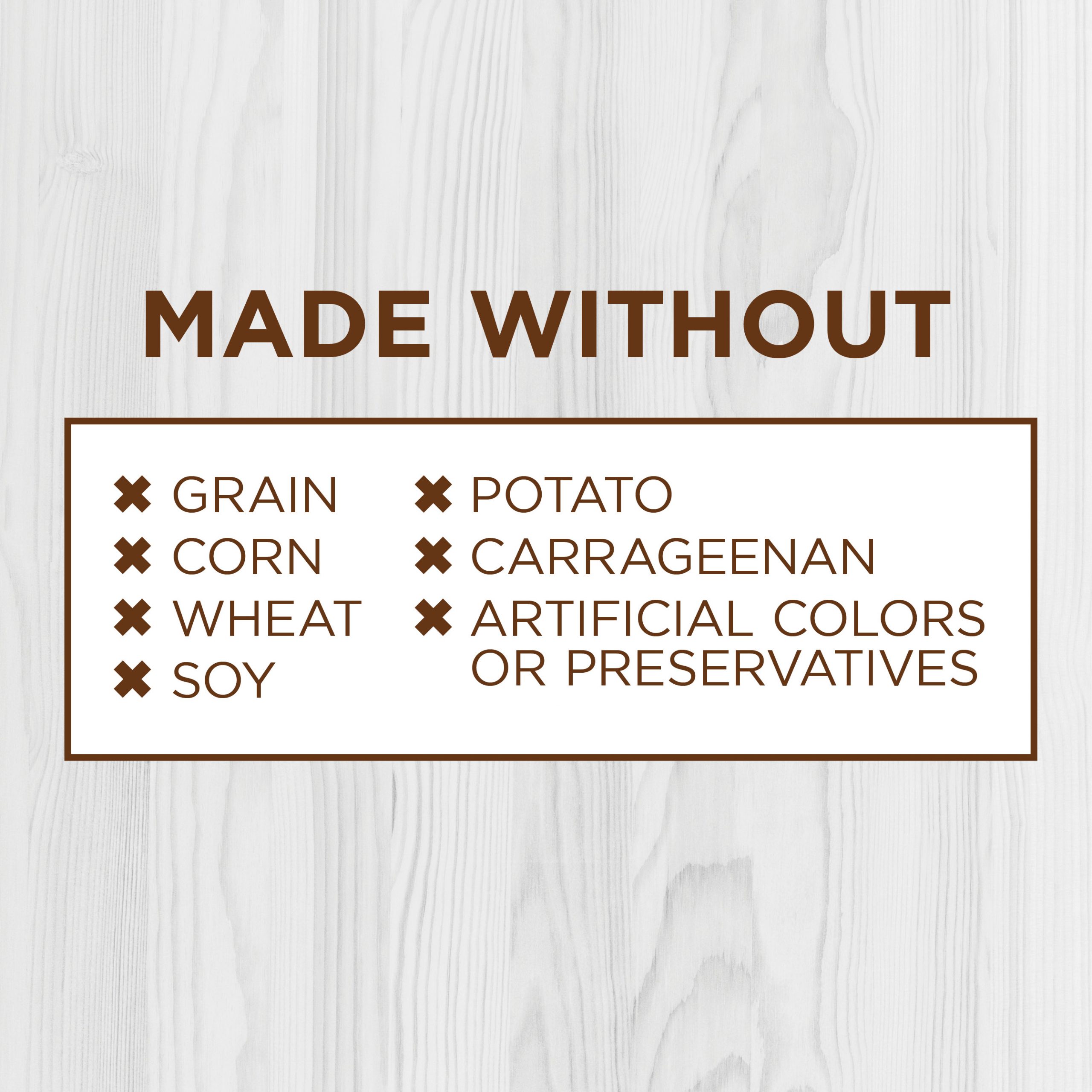- Never contains any grains, potato, corn, wheat, soy, by-product meal or artificial colors or preservatives.