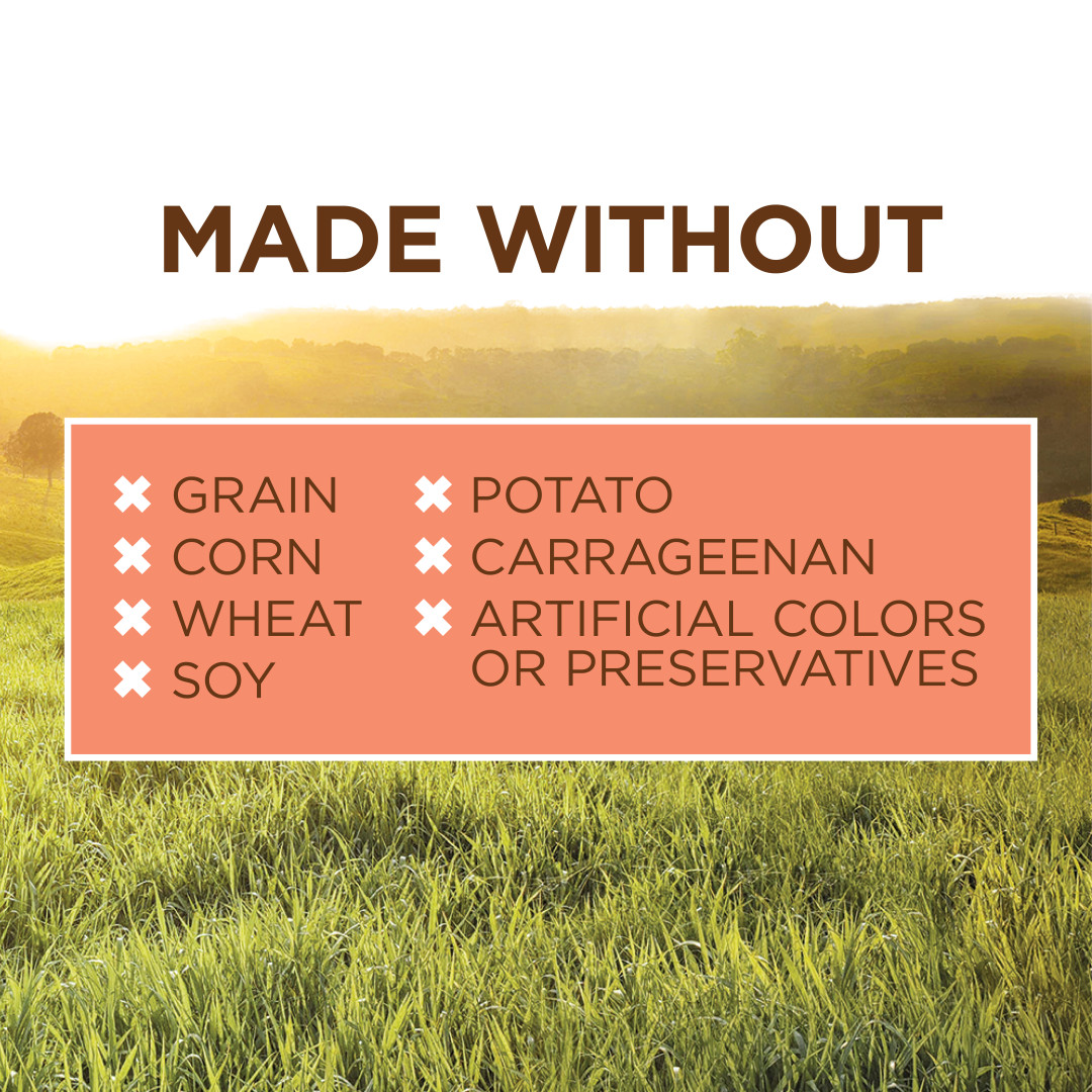 - Made without – grain, potato, corn, wheat, soy, by-product meal, artificial colors or preservatives