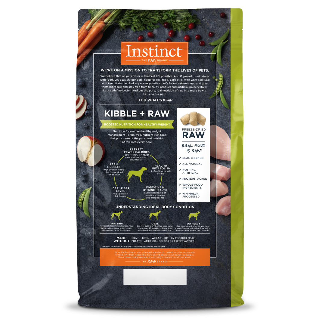 High animal-protein, grain-free, boosted nutrition with bites of freeze-dried raw meat, Instinct Raw Boost Grain-Free Recipe with Real Chicken for Healthy Weight is a better way to feed kibble. Unlock your dog’s potential to thrive and put more of the pure, real nutrition of raw into every bowl.