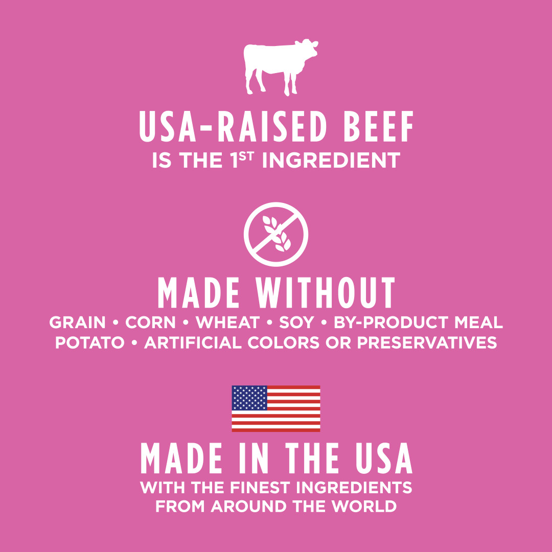- USA-raised beef is the first ingredient – protein packed for strong, lean muscles; ideal balance of protein, fat & calories for healthy body weight