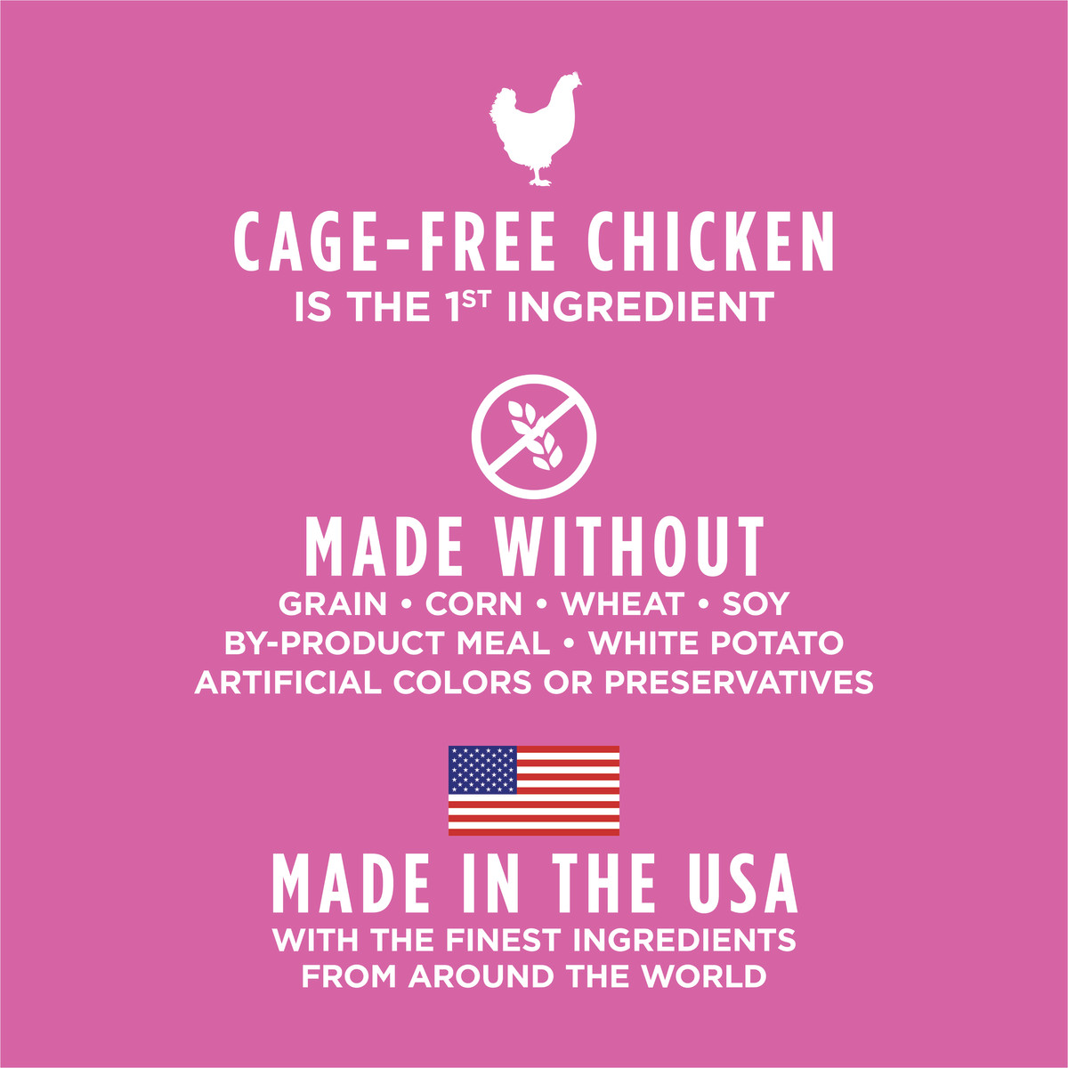 - Cage-free chicken is the first ingredient – protein packed for strong, lean muscles; ideal balance of protein, fat & calories for healthy body weight