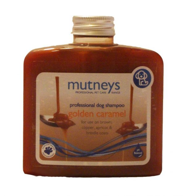 Mutneys ‘golden caramel’ Shampoo naturally brings out the shine and colour of brown, copper & brindle dog coats, with a delicious warm caramel scent.