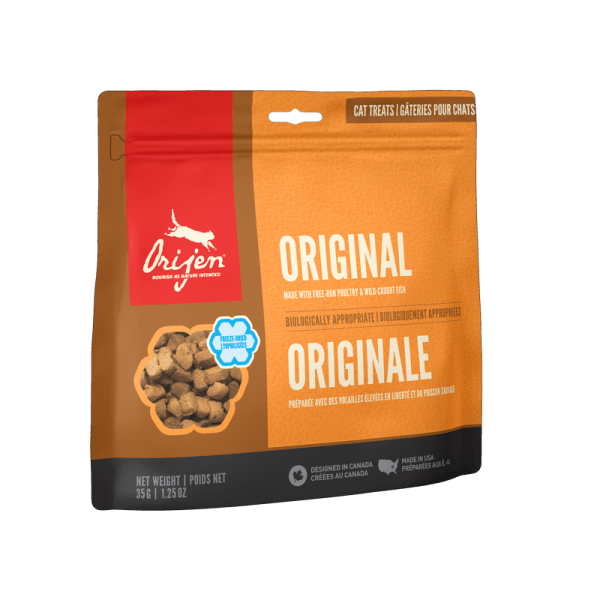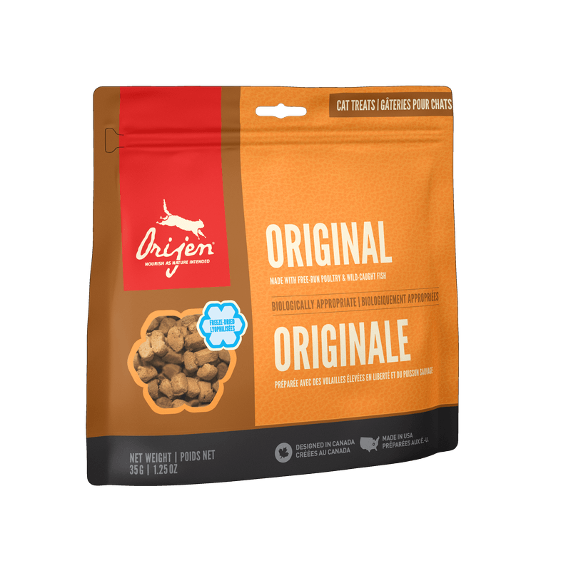 ORIJEN Freeze-Dried Treats are crafted with the same quality ingredients that make up our trusted foods. Our Original Treats are made from 100% raw free-run chicken and turkey, and wild-caught monkfish, gently freeze-dried to lock in the nourishing protein and delicious flavour. Wholesome and tasty, they’re a reward that your cat will love.