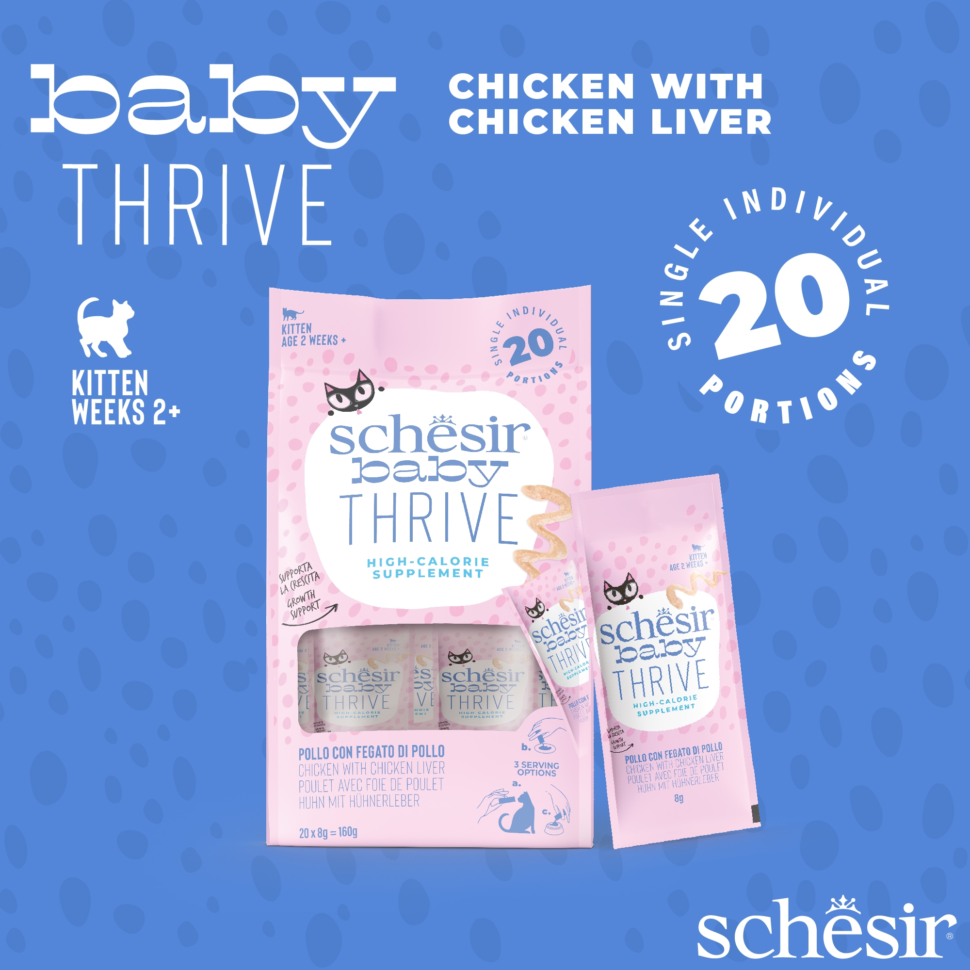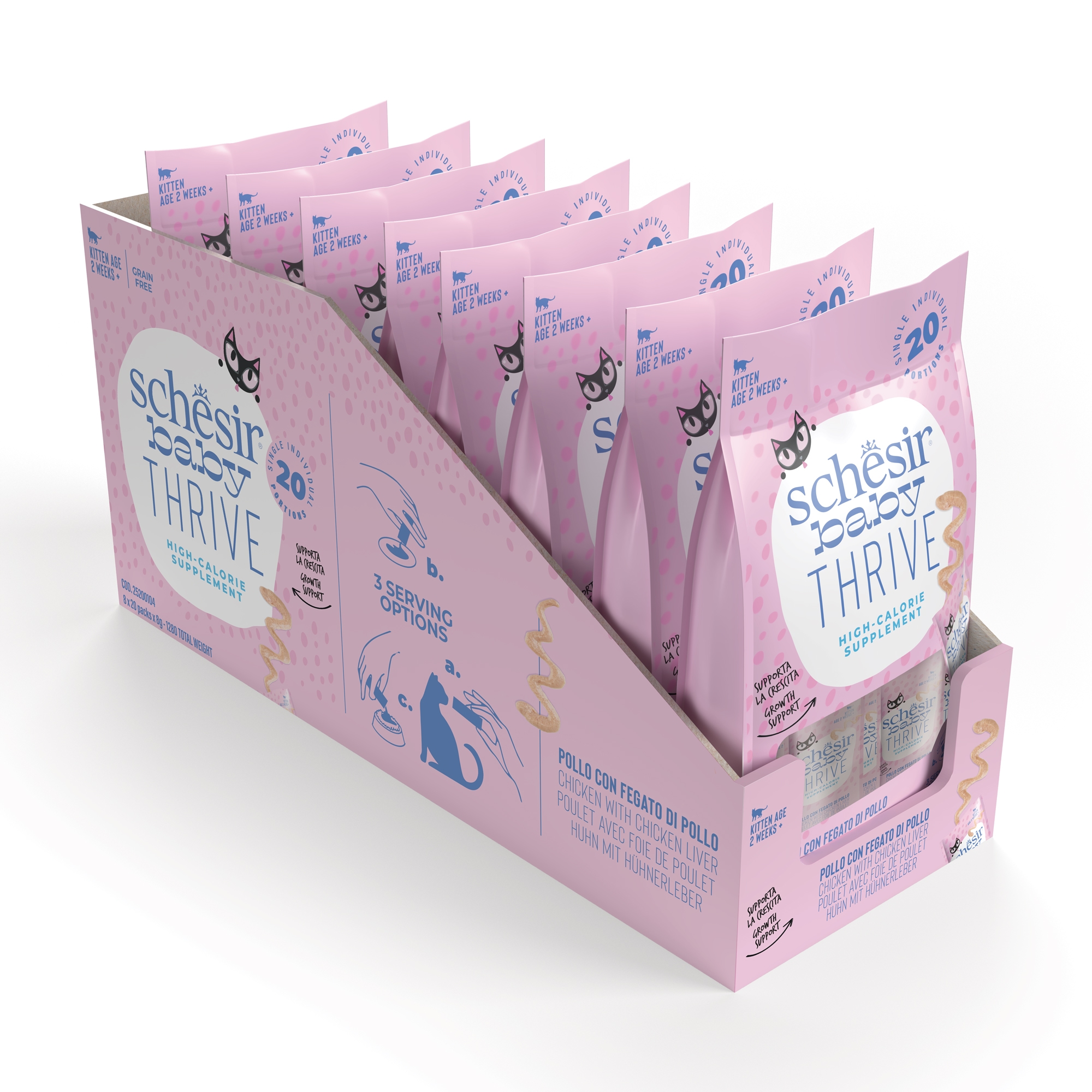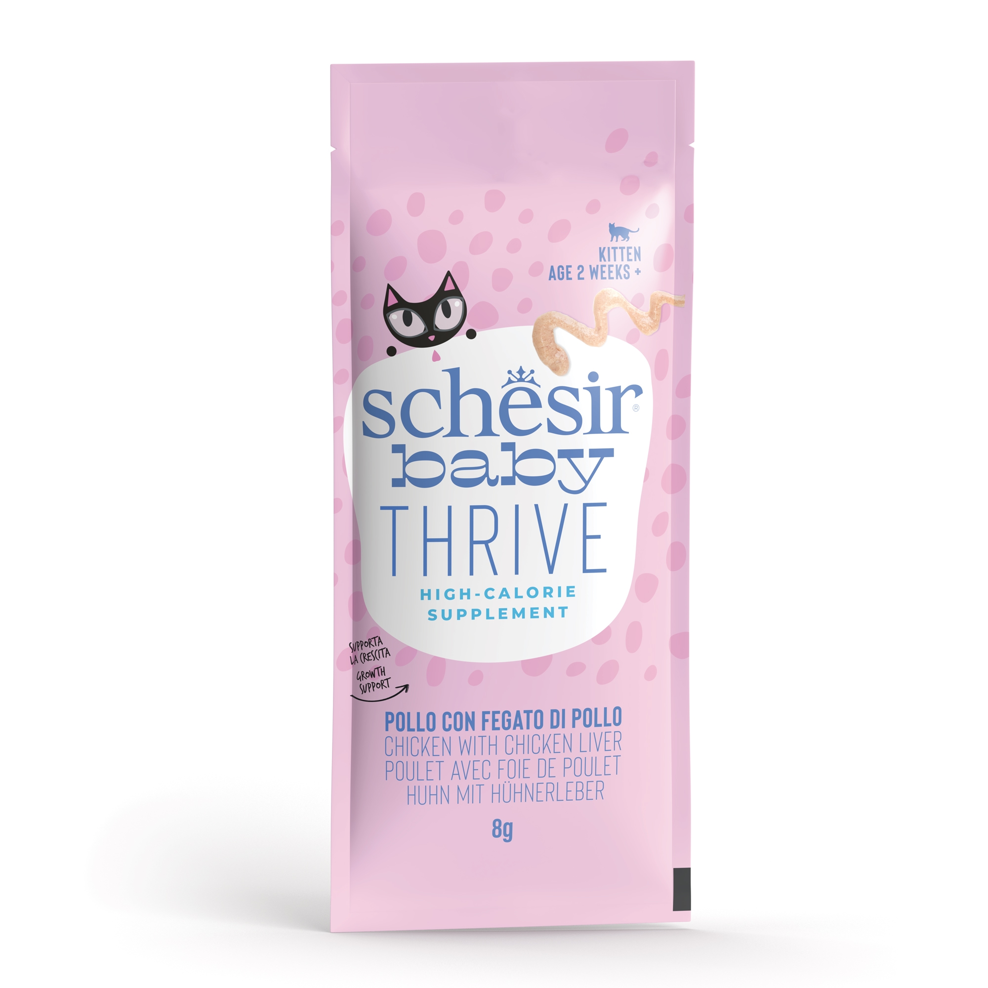 An energy supplement that supports growth, indicated for kittens who are underweight or losing weight, based on real chicken fillets, with nourishing and tasty chicken liver, blended into a soft mousse. Suitable from two weeks of life. Practical box of 20 single-serving packets.