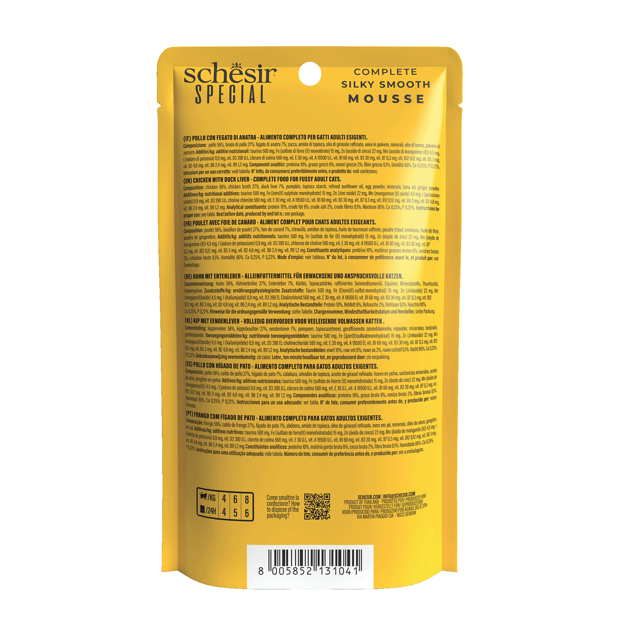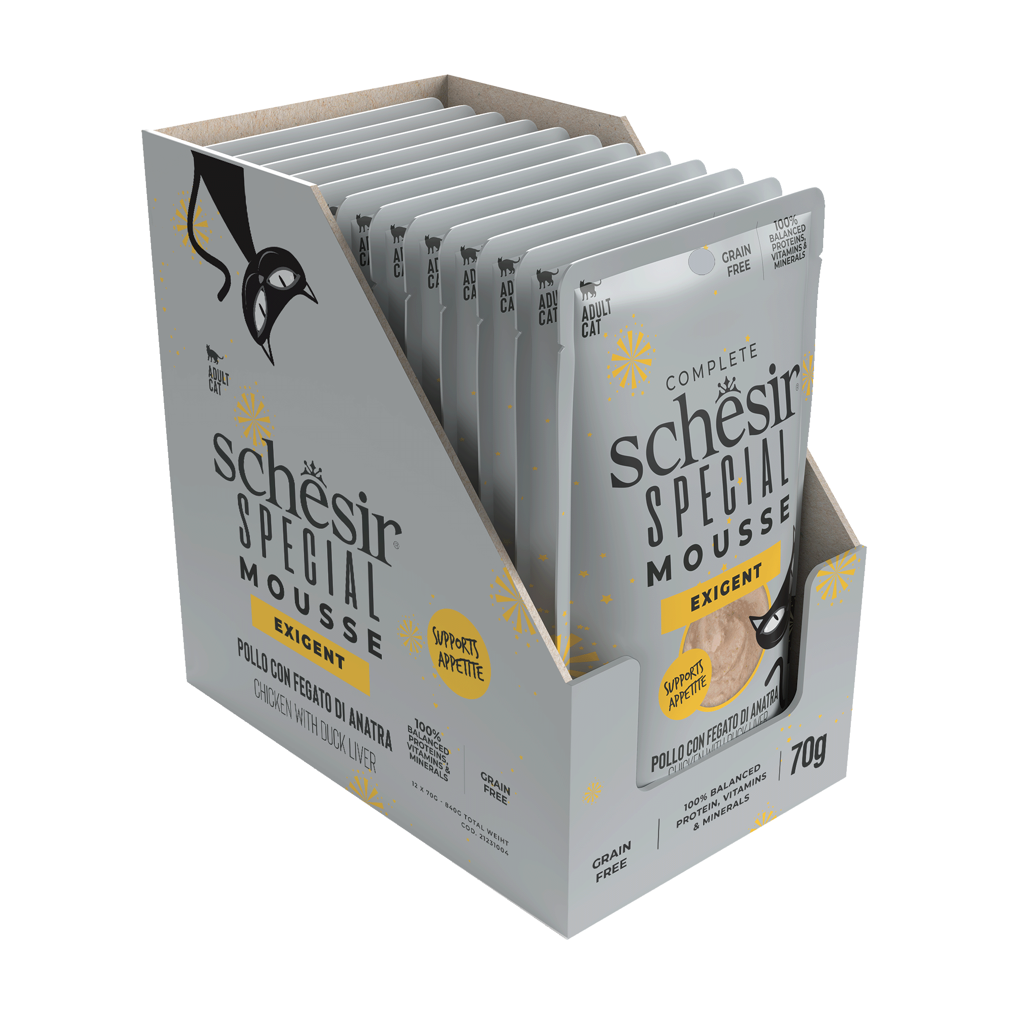 A recipe specifically formulated for fussy cats, based on real chicken meat, with nourishing and tasty duck liver, blended into a soft and velvety mousse.