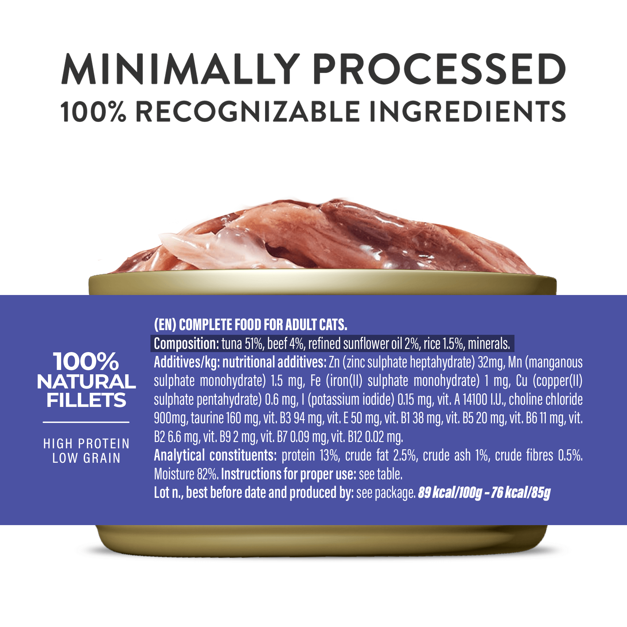 Real steamed tuna fillets with beef in jelly for a natural and irresistible mix.